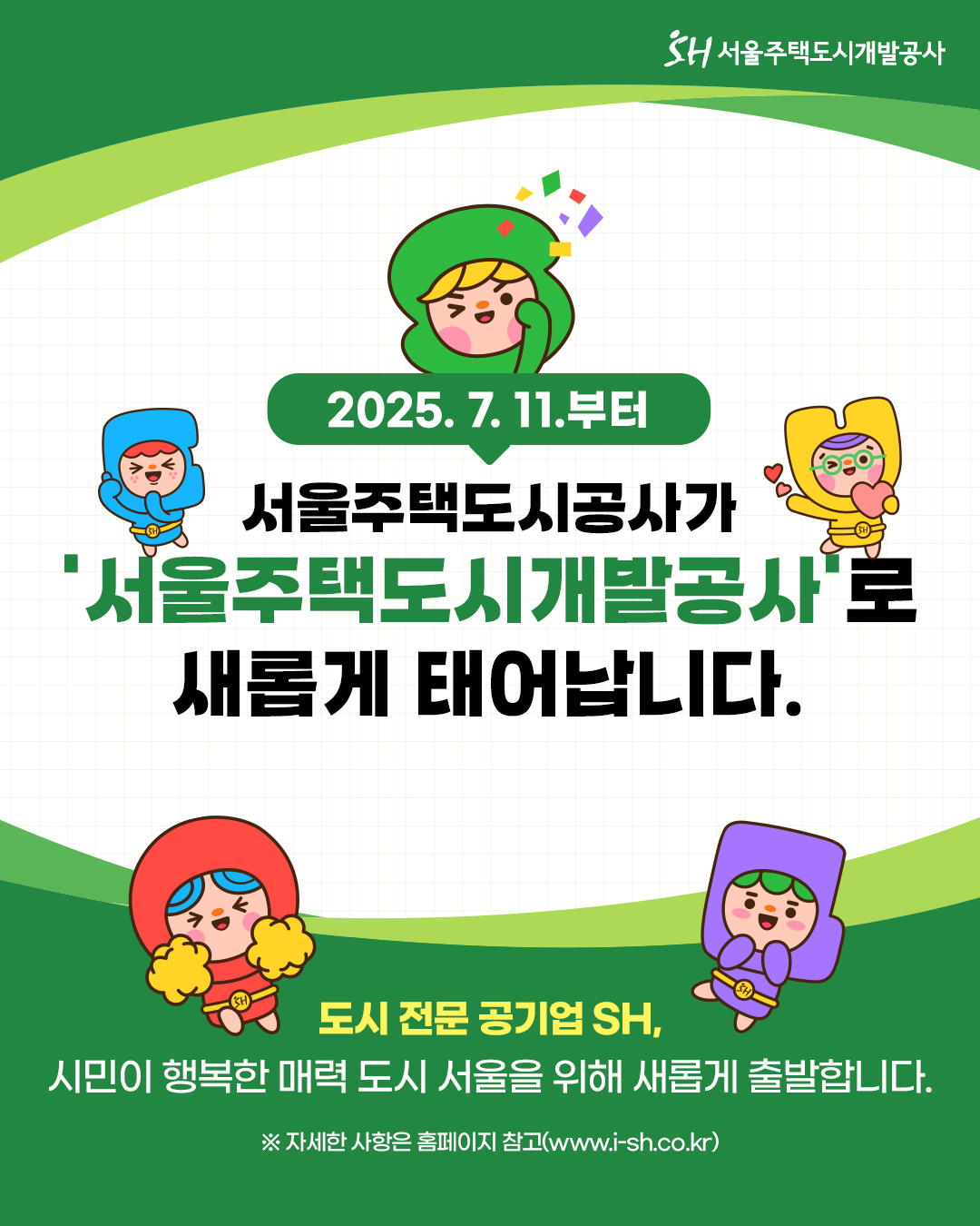 지난 7월 11일, 서울주택도시공사가 ‘서울주택도시개발공사(SH)’로 사명을 공식 변경했다. 이번 사명 변경의 목표는 서울 시민의 주거 복지 향상과 서울의 글로벌 경쟁력을 견인하는 개발 전문 공공기관으로서 역할과 정체성을 강화하는 것이다.