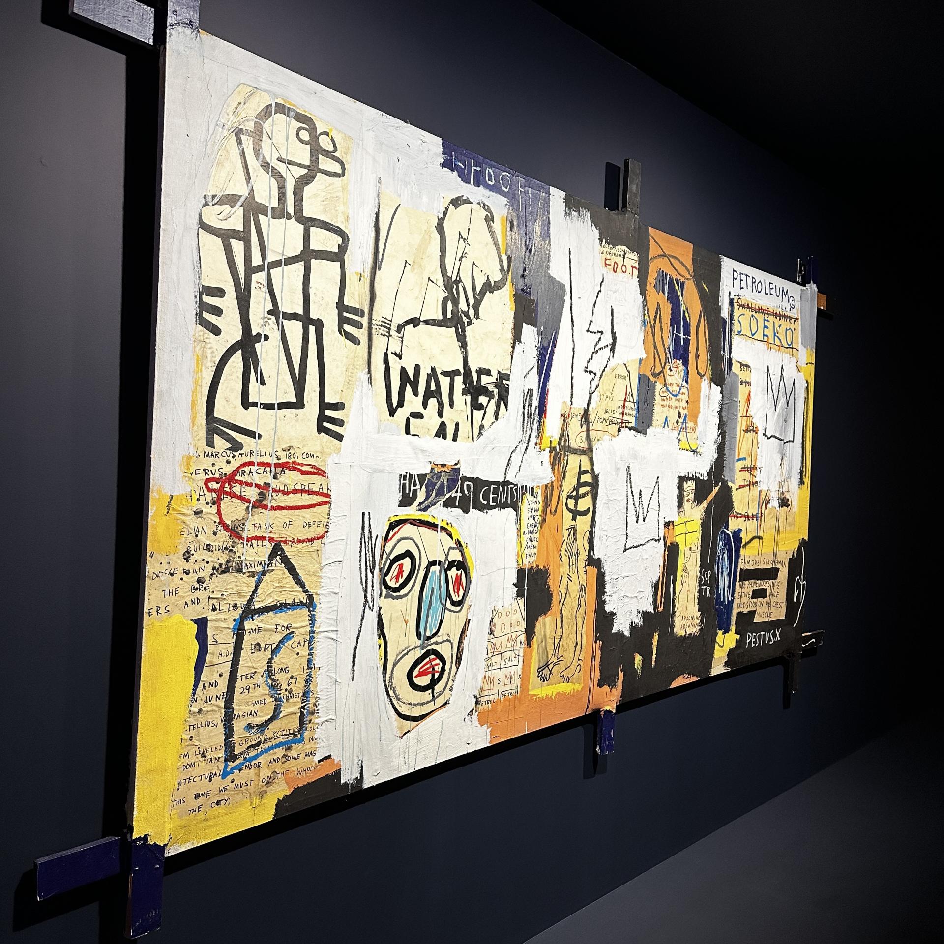 1982년의 시기를 중심으로 구성된 첫 공간에서는 바스키아가 캔버스의 형식 자체를 해체하며 물질적 실험을 시도한 작품들이 소개되었다. 그는 천을 나무판자나 팔레트에 직접 붙이고 못이나 새끼줄로 고정해 회화의 표면을 하나의 구조물로 변형했다. 이러한 방식은 전통적인 화폭의 한계를 넘어서는 시도이자 그가 예술을 하나의 ‘조립된 제단’처럼 다루었음을 보여준다. 대표작인 Phooey에는 ‘JAPANESE LOUDSPEAKER’라는 문구가 등장하는데, 이는 동시대 일본의 경제·기술력과 그 자신이 속한 문화적 혼성의 현실을 반영한 상징적 언어로 읽힌다.