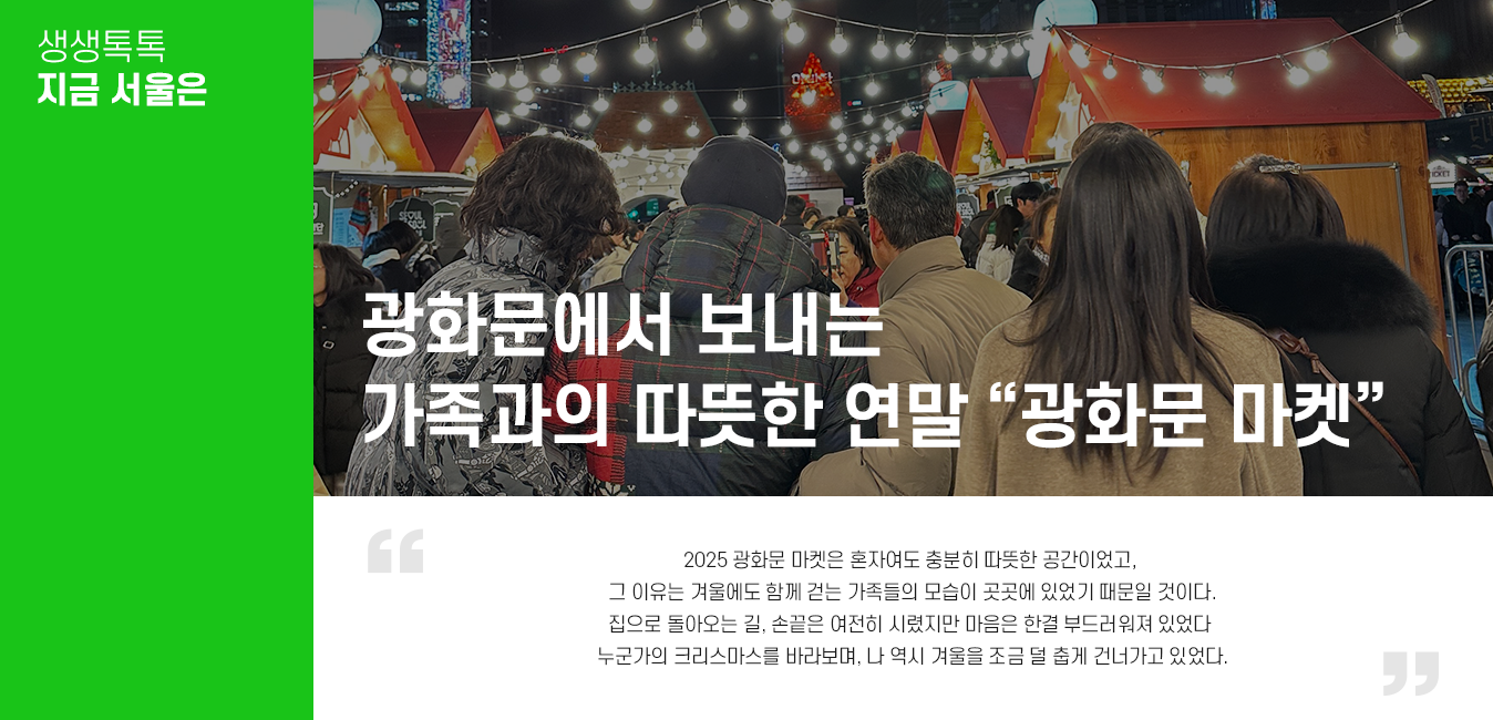 집으로 돌아오는 길, 손끝은 여전히 시렸지만 마음은 한결 부드러워져 있었다.2025 광화문 마켓은 혼자여도 충분히 따뜻한 공간이었고, 그 이유는 겨울에도 함께 걷는 가족들의 모습이 곳곳에 있었기 때문일 것이다. 누군가의 크리스마스를 바라보며, 나 역시 겨울을 조금 덜 춥게 건너가고 있었다.