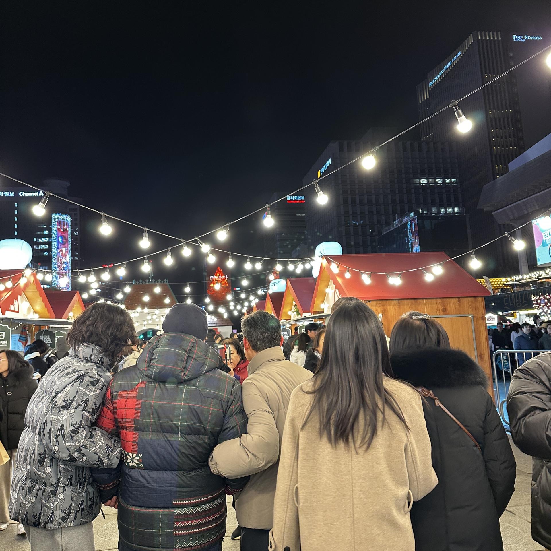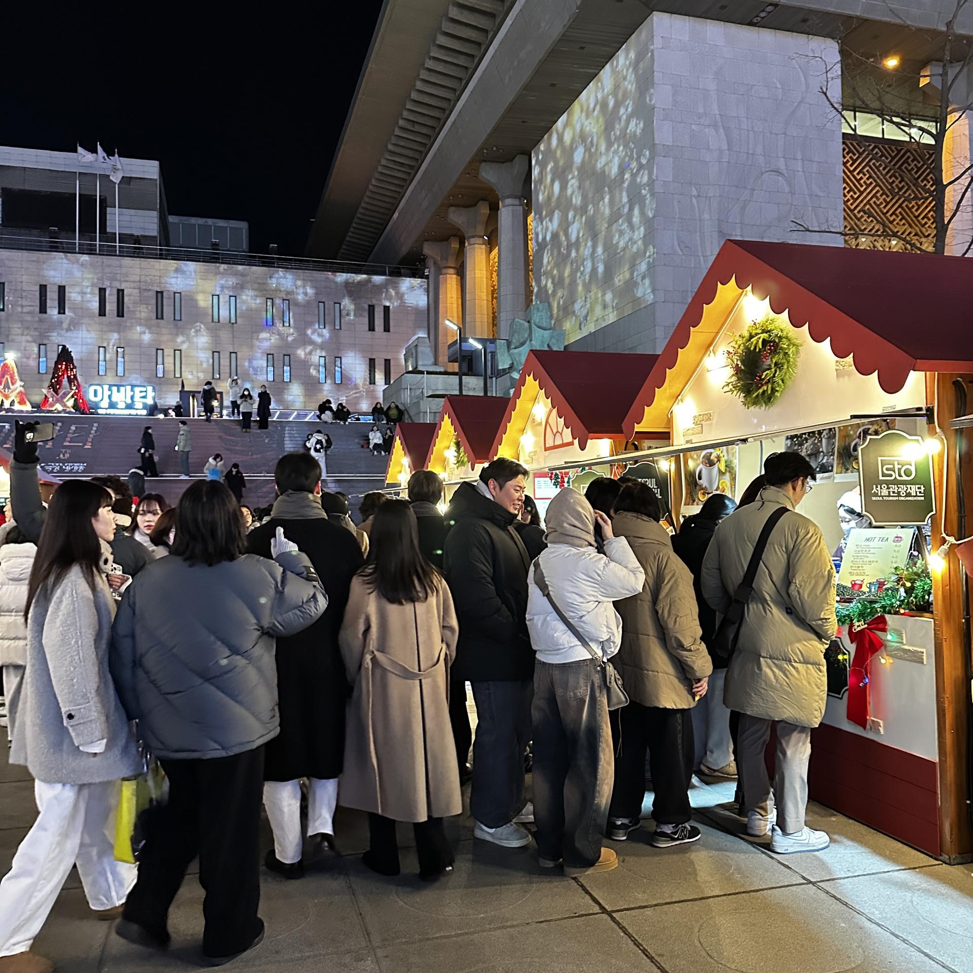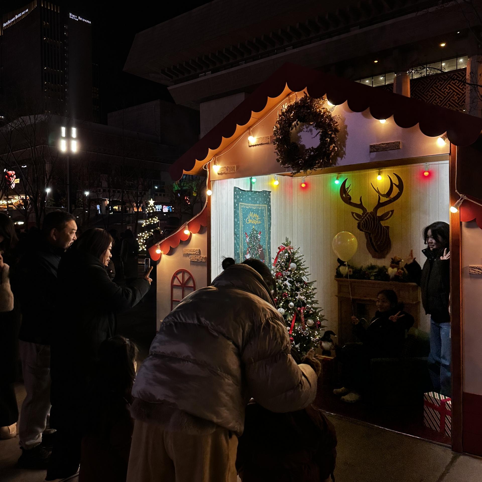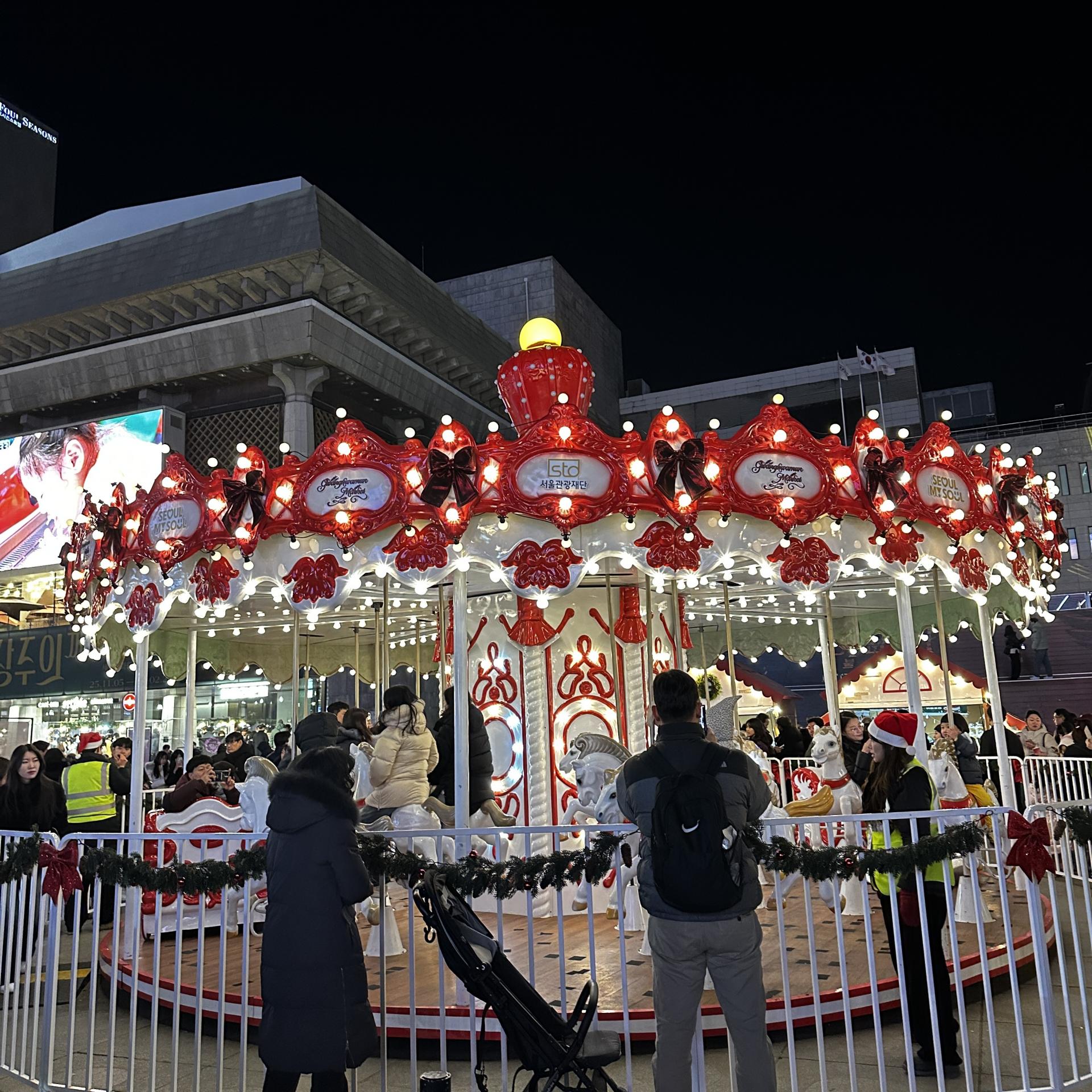 놀이광장에서는 루돌프 회전목마가 반짝이며 천천히 돌고 있었다.아이의 웃음소리가 음악보다 먼저 귀에 들어왔다. 핫초코를 나눠 들고 서 있는 가족, 간식을 사기 위해 줄을 선 부모의 뒷모습, 회전목마가 멈출 때마다 커지는 환호성까지.