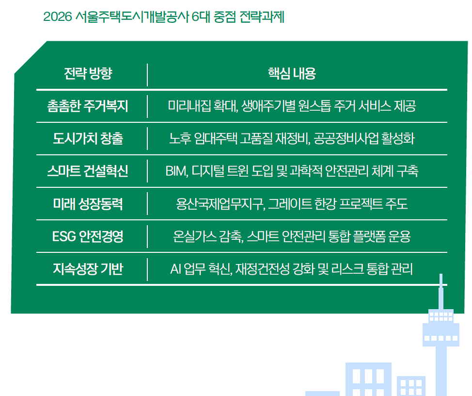2026년, 서울주택도시개발공사는 ‘시민이 행복한 매력도시 서울을 만드는 도시전문 공기업’이라는 비전 아래 새로운 도약의 원년을 맞이했다. 지난해 ‘미리내집’의 성공적 안착과 ‘ESG 경영 강화’라는 성과를 발판 삼아, 올해는 주거복지부터 도시혁신, 미래 성장동력 확보까지 6대 전략 과제를 중심으로 서울주택도시개발공사의 경쟁력을 한 단계 더 끌어올릴 계획이다.